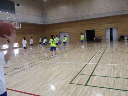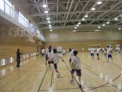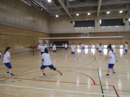 体育館では、バスケットボール部とバレーボール部が活動しています。大会に向けて気合いが入っています。