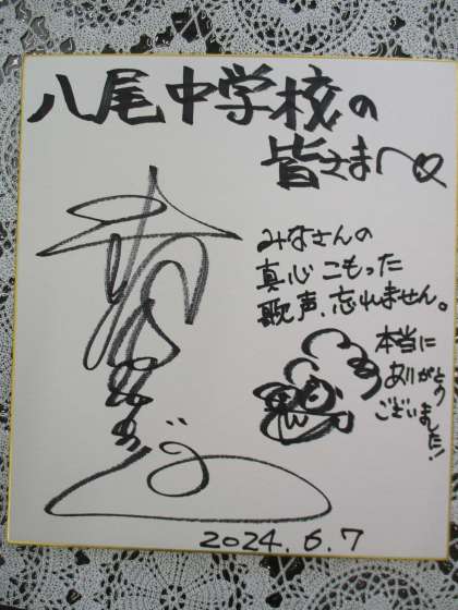 八尾中学校生徒にメッセージ付きの色紙をいただきました。色紙は、職員室前の展示コーナーにあるので是非見てくださいね。