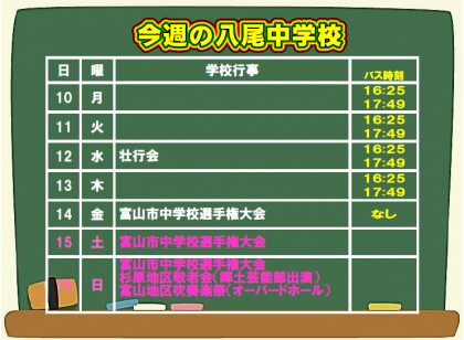 14日(金)から富山市中学校選手権大会が行われます。県大会や北信越大会につながる大会です。運動部の皆さん、頑張ってきてください。