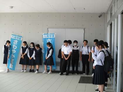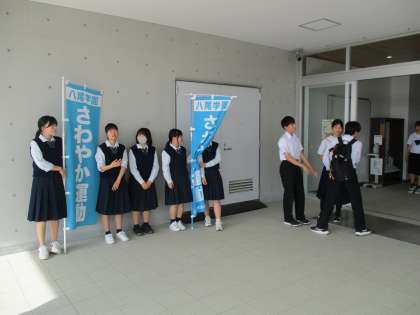 今朝は、八尾高校の生徒の皆さんが来校し、生徒玄関前で爽やかな挨拶が交わされました。昨年度の卒業生との懐かしい再会に笑顔がたくさん見られました。