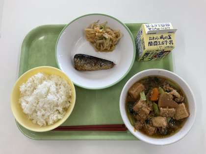 今日の給食には、カルシウムを多く含む切り干し大根、小松菜、厚揚げ、ごま、牛乳が使われています。骨や歯の健康は、成長期から20歳くらいまでにどれだけ丈夫な骨や歯をつくるかで決まります。そのためには、カルシウムをしっかり取ることが大切です。