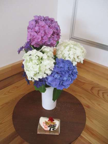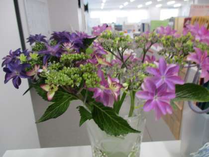 紫陽花の季節です。学校の至る所に様々な色の紫陽花の花が生けてあります。様々な種類がありますね。色も育った土の性質で変わるそうです。
