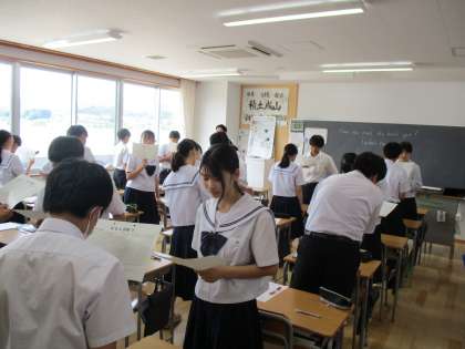 写真中は、英語の授業の様子です。ペアトーク中です。