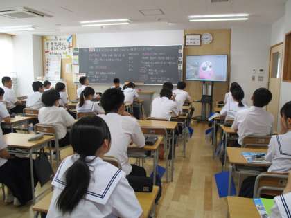 写真下は、社会の授業の様子です。意見が対立した際の解決方法について、ビデオを見ながら学習しています。