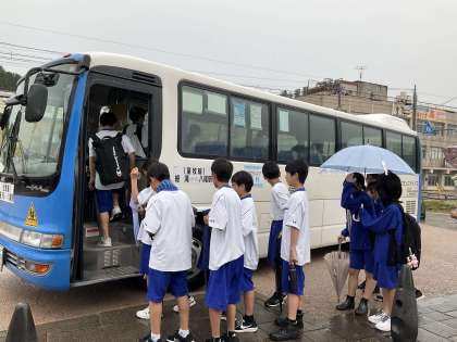 今日は1年1組が、コミュニティバスを利用して現地まで移動し、職員の方から説明を聞いています。