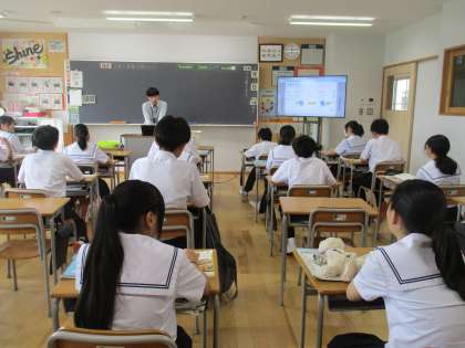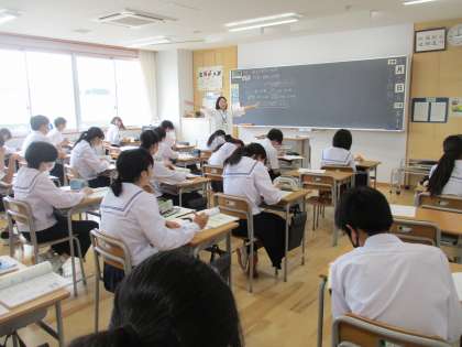 写真上は、数学の授業の様子です。連立方程式を活用して問題を解く練習をしています。