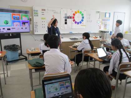 写真上は、美術の授業の様子です。chromebookで14歳の挑戦のまとめの新聞を作成するため、そのデザインや作成の仕方を学習しています。