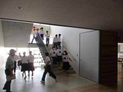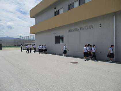 1年生は、生徒玄関から、2年生は非常階段から、3年生は南階段から非常口を通って、、、とそれぞれの避難経路に従って避難しました。
