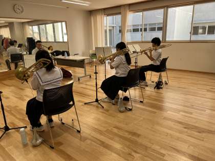 トロンボーンはレッスンの日です。外部の先生をお招きし、基礎練習の仕方から教わっています。コンクール前の貴重な練習になりますね。