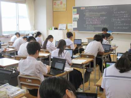 写真上は、技術の授業の様子です。身の回りの課題についてchromebookで調べてまとめています。