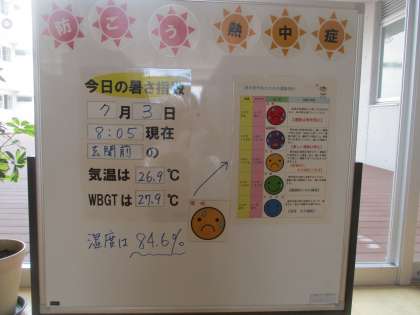 熱中症警戒ゾーン。喉が渇く前に水分を摂り、熱中症予防に努めましょう。