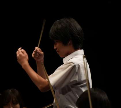 7月1日にオーバード・ホール・中ホールにて行われた「桐朋アカデミー・オーケストラ」音楽観賞会で、指揮者体験をしたSさんの様子です。