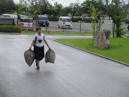 ペットボトルが入った大きな袋を2つも持って登校する生徒。生徒会企画に積極的に協力しています。