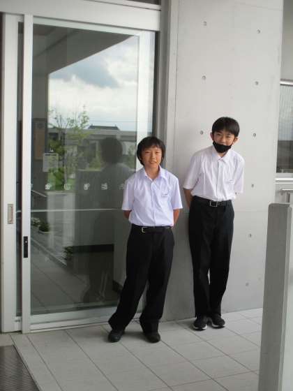 今朝も昨日から2人の1年生が生徒玄関に来て、主体的に挨拶運動をしています。続くと本物です!
