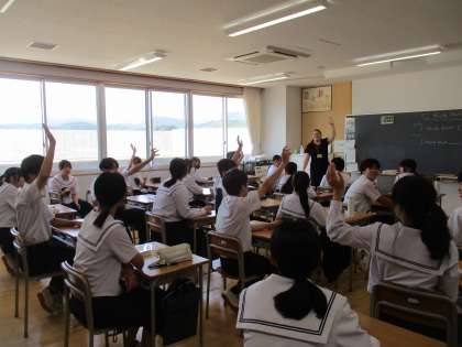 ALTの先生と楽しく活動をしながら新しい表現の学習をしています。