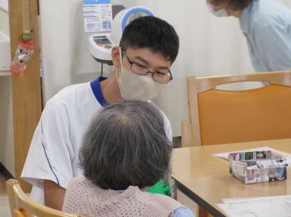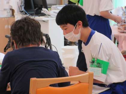 オリエンテーションをしてから、利用者さんとの交流タイムです。利用者さんの目を見て、一生懸命に話を聞いています。