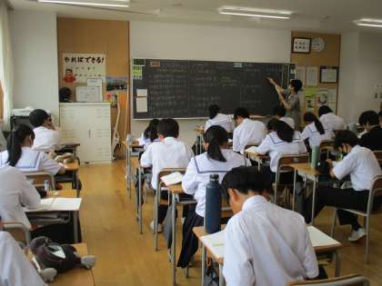 写真下は、数学の授業の様子です。1次式をどんどん解いて慣れていきます。