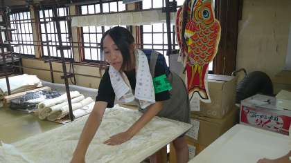 桂樹舎での活動の様子です。和紙を強くする作業をしています。職人の技を近くでひしひしと感じながら、慎重に作業しています。