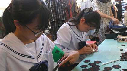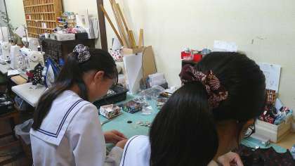 tadasでの活動の様子です。本来は定休日ですが、着物の切れ端を使って、マグネットを作成しています。役割を分担しながら活動に取り組んでいます。