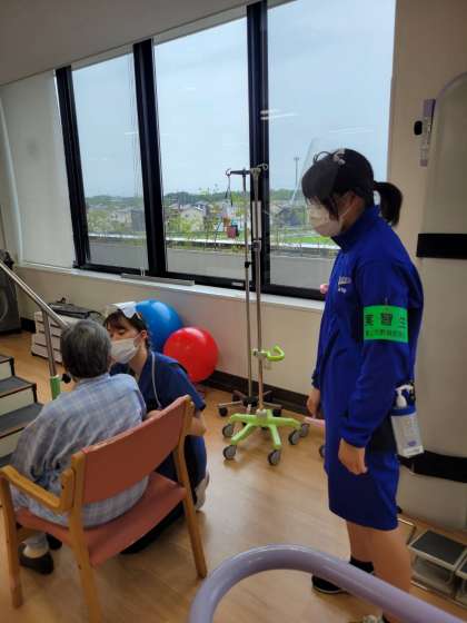 富山西総合病院での様子です。今日は2チームに分かれて活動しています。1つのチームは栄養バランスを考えた食事の献立をつくっています。もう一方のチームは、リハビリの補助をしています。
