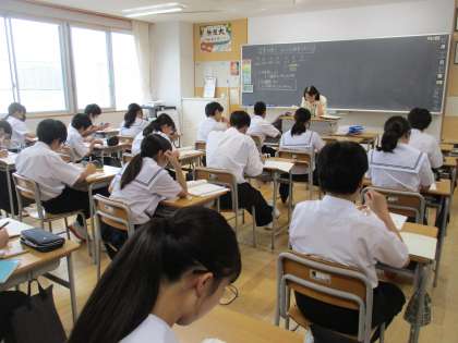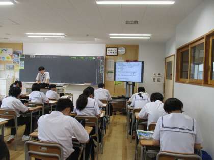 写真上は、数学の授業の様子です。文字式の学習をしています。