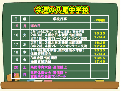 今週はどの学年も外部から講師の先生をお招きした講座や外部に出ていく体験活動、外部との交流等があります。学びの多い1週間にしてください。