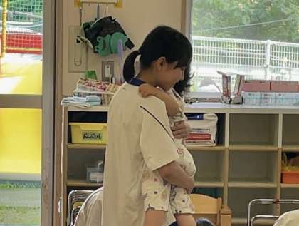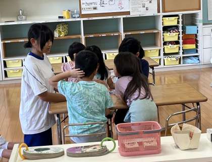 八尾保育所での活動の様子です。お昼寝の間は草取りや教室の掃除をしています。その後はお昼寝からおやつタイムの準備をしました。優しいお兄ちゃん先生、お姉ちゃん先生大活躍です!!