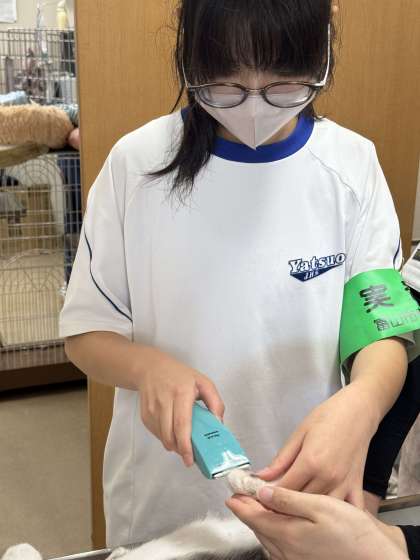 あらい犬猫病院での活動の様子です。猫のブラッシングや爪切りをしています。バリカンの使い方等を指導していただきました。