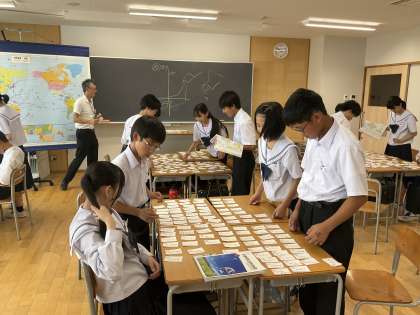 写真下は、社会科の授業の様子です。世界の国の特徴や、日本との時差を計算して、国を探し出すカルタに取り組んでいます。