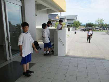 今朝も自主挨拶運動の3人が生徒玄関に。スタートをきった日からずっと続けています。