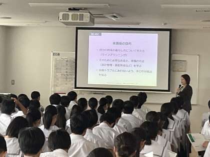 金融教育の出前講座を受講しています。銀行の専門家の方から、将来設計の立て方や、金融トラブルへの対処法等について学習しています。
