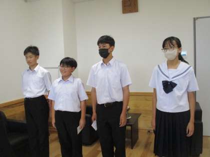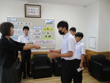 個人で所属している競技団体から、県選抜を勝ち上がり、全国大会へ進出した生徒に八尾中学校地域学校共同本部からの激励品を、校長先生から渡しました。