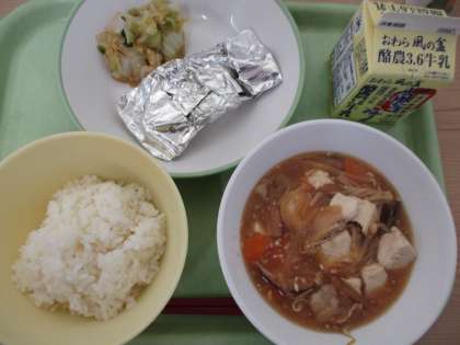 「鯖の銀紙焼き」は、一つ一つ魚を包む手間がかかっています。甘味噌の味が食欲をそそりますね。1学期の給食も残すところあと明日1日です。