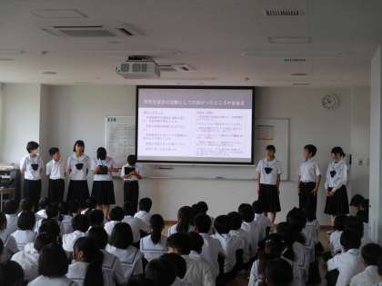 学年生徒会が1学期を振り返って、よかったところ、2学期に向けて改善すべきことを紹介しました。入学してから4か月で、すっかり中学生らしくなりましたね。