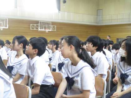 生徒指導主事から、「命」を守る話、情報担当からメディアの使い方についての話がありました。情報担当からのSNSに関する話については、chromebookのクラスルームにもアップしてありますので、ご家族で繰り返しご覧いただけると幸いです。
