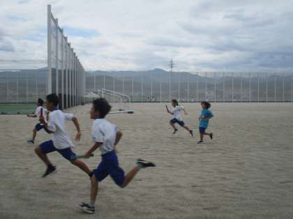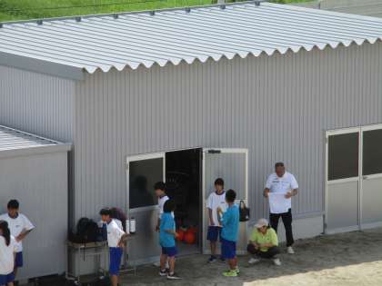 陸上部もリレーの練習に励んでいます。倉庫前の陰で休みながら。