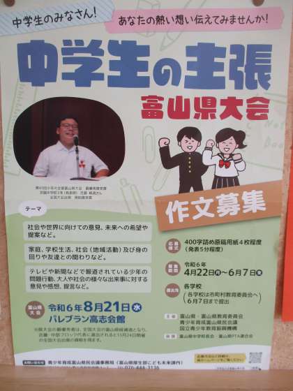 8月21日(水)高志会館で開催される「中学生の主張富山県大会」に2年生のIさんが富山市の代表として発表者に選ばれました。1727点という多数の応募の中で、42点が県へ推薦され、さらにその中から選出されました。大変名誉なことです。素晴らしいですね。