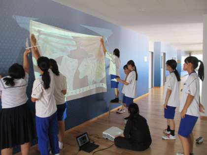 デコレーション係は、壁に投影して全体像をイメージしています。