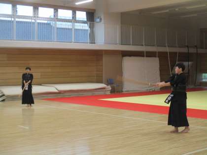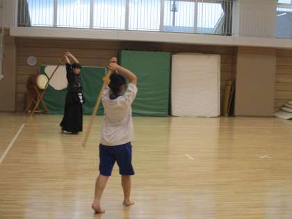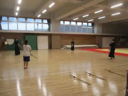 剣道部は、4人で素振りの練習中です。大きなかけ声を出しながら練習しています。