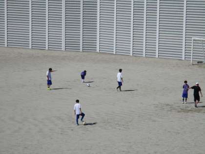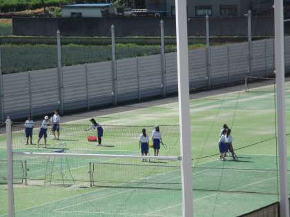 野球部、サッカー部、ソフトテニス部がそれぞれの場所で活動しています。こまめにテントで休息しながら。
