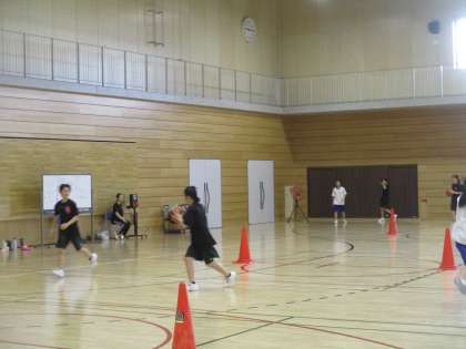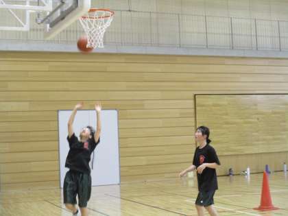 1コートあたりの人口密度は、男子に比べると低いです。パスからのシュート練習をしています。女子バスケットボール部も挨拶が素敵です。