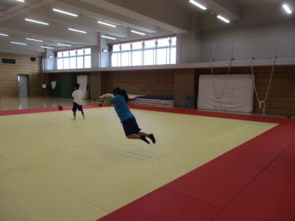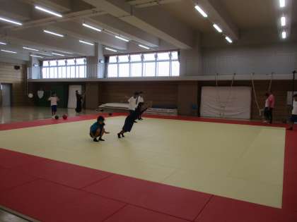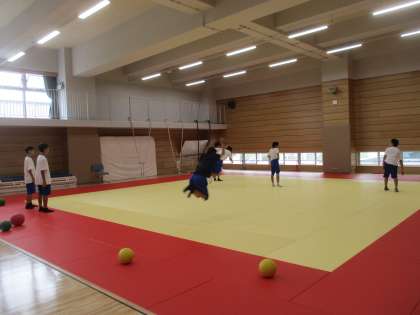 柔道場で地域の講師の先生に指導してもらっています。立ち幅跳びのトレーニングをしています。