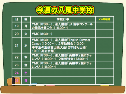 夏休み最終週となりました。部活動、駅伝練習、YMCや勉強会等、最後まで頑張りましょう!