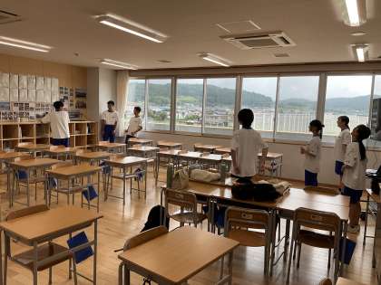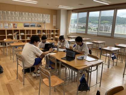 3年生の教室では、体育大会の団リーダーが団活動の準備をしています。
