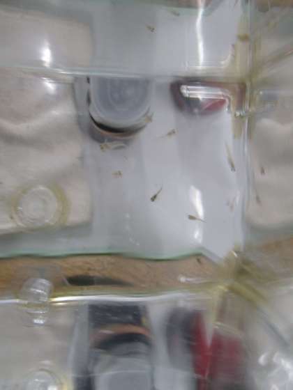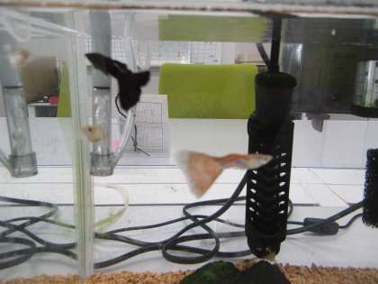 お盆期間中、生まれたての9匹の赤ちゃんのうち残念ながら6匹死んでしまいましたが、お盆明けに、新たにまたたくさん卵からかえって赤ちゃんグッピーがベビールームで泳いでいます。