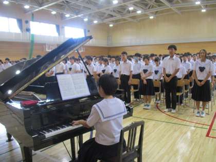 全校生徒、全教職員で校歌を斉唱して始業式を終えました。