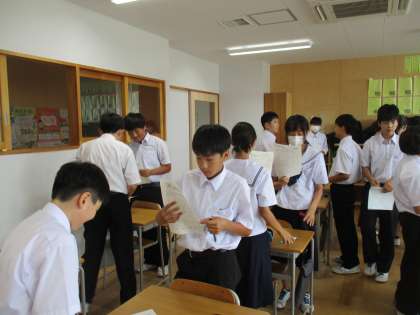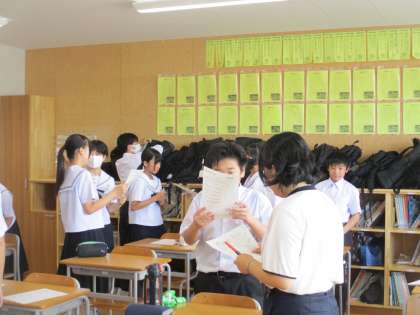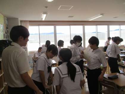 夏休み中の出来事をビンゴ形式で対話しています。楽しそうに思い出を語り合っています。