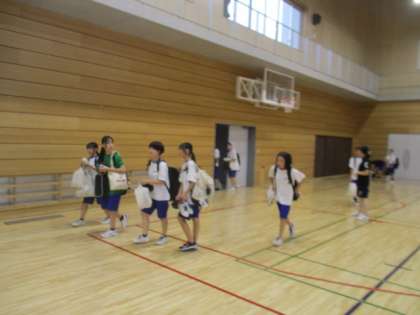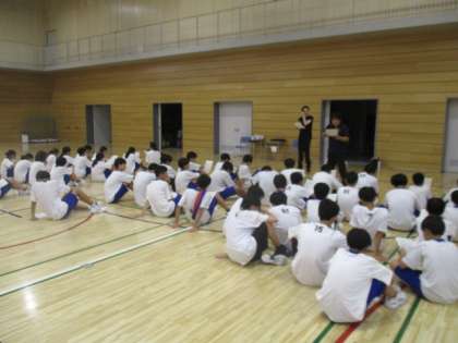 部活動後にミーティングをしています。プリントを見ながら真剣に話を聞いています。