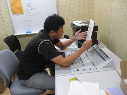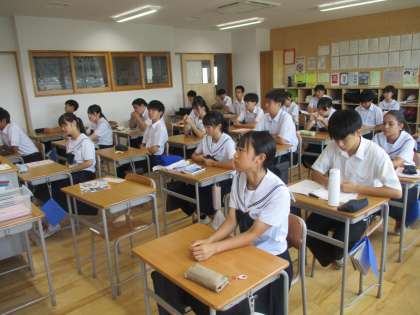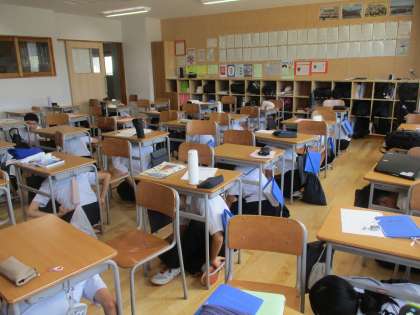 生徒は放送を静かに聴き、地震発生の合図に合わせて、私語一つせず机の下に身を隠し1分間じっと地震が収まるのを待ちました。