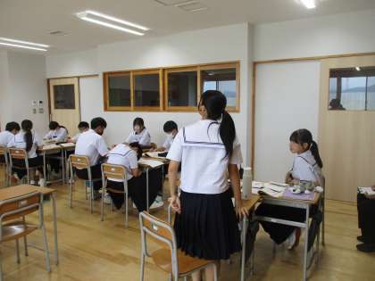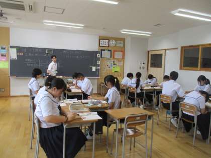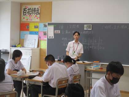 沸騰する時間を表す表を見ながら、規則性を考えています。実習生の先生の授業です。